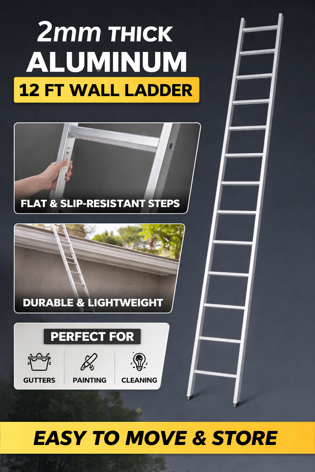 2mm Heavy‑Duty 12‑Foot Wall‑Reclining Aluminium Ladder with Flat Anti‑Slip Steps | Industrial‑Grade Straight Leaning Ladder | Lightweight, Rust‑Proof Aluminium for Home, Shop & Outdoor Use